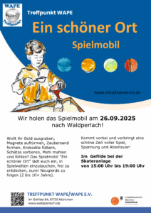 Veranstaltungen in Waldperlach « Alle Veranstaltungen Diese Veranstaltung hat bereits stattgefunden. Spielaktion „Ein schöner Ort“ September 26 @ 15:00 - 19:00 Details Datum: September 26 Zeit: 15:00 - 19:00 Website: https://einschoenerort.de/spielangebote/ Veranstaltungsort Grünzug (Festplatz) Veranstalter Treffpunkt WAPE Ein schöner Ort Zum Kalender hinzufügen Google Kalender iCalendar Outlook 365 Outlook Live Details Datum: September 26 Zeit: 15:00 - 19:00 Website: https://einschoenerort.de/spielangebote/ Veranstaltungsort Grünzug (Festplatz) Veranstalter Treffpunkt WAPE Ein schöner Ort zurück zu WAPE e.V.